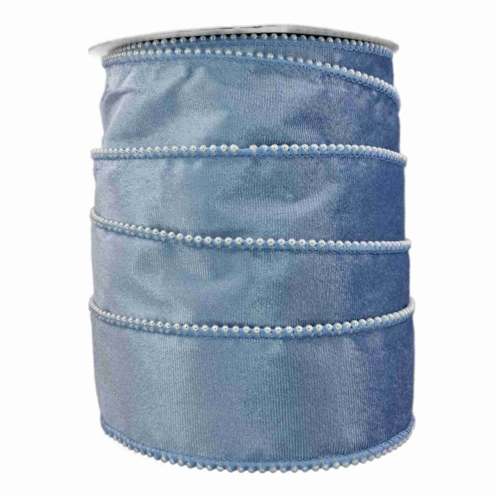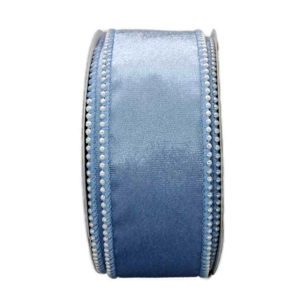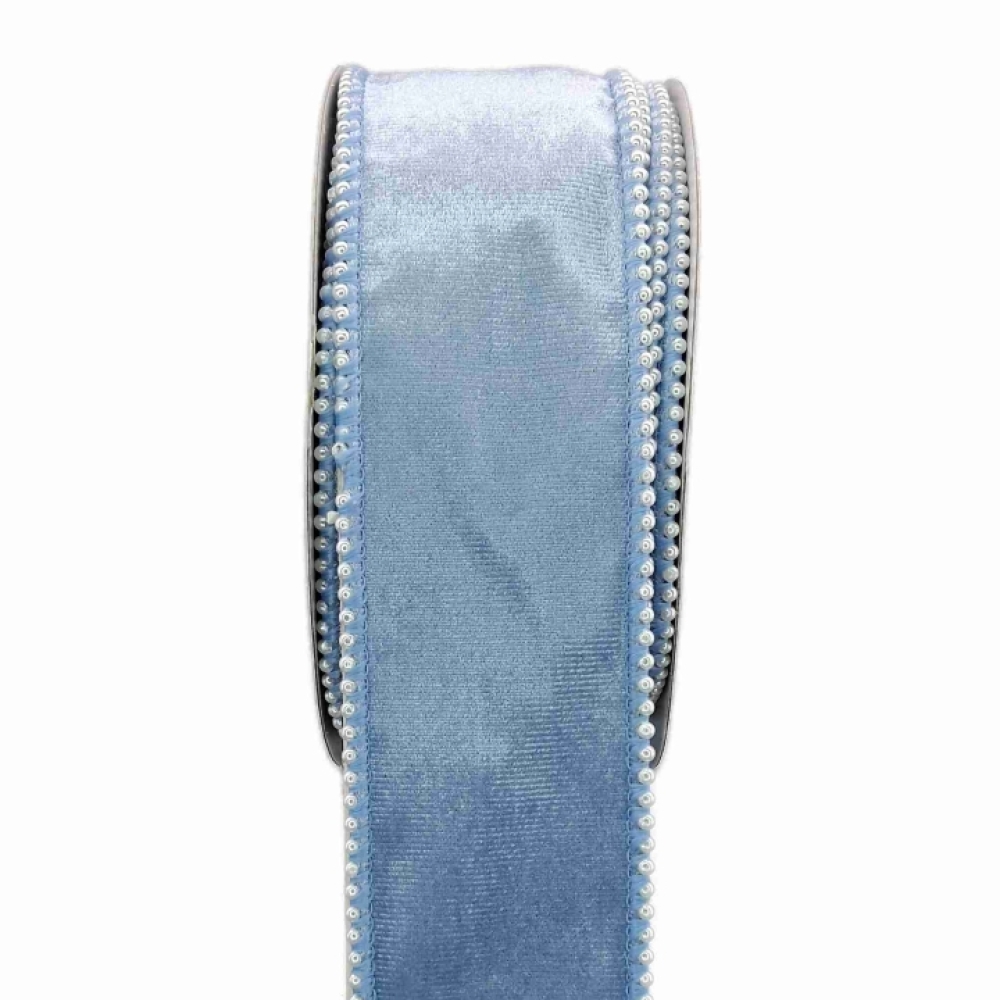 Sametová stuha ve světle modré barvě s perličkovým okrajem, luxusní vzhled vhodný pro svatby, zimní dekorace a dárky.