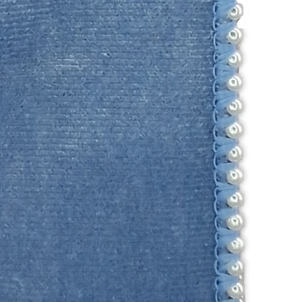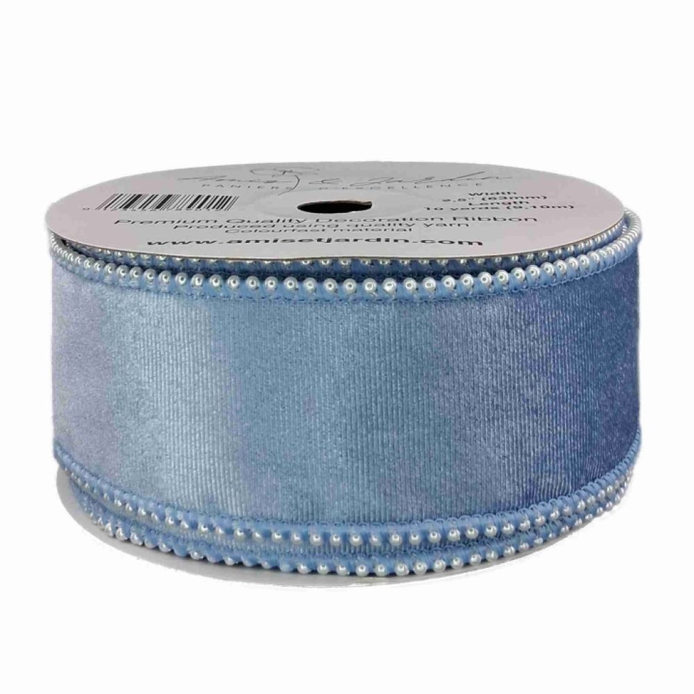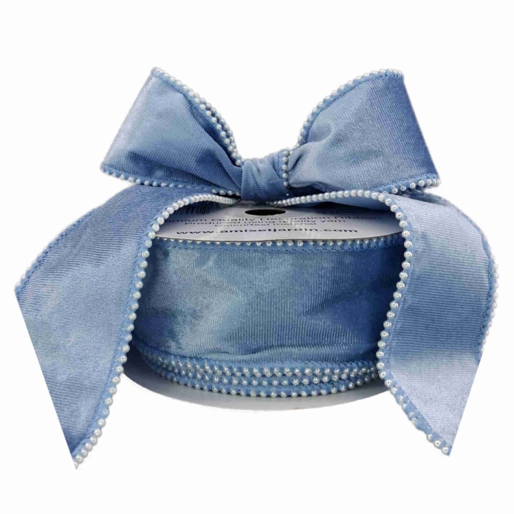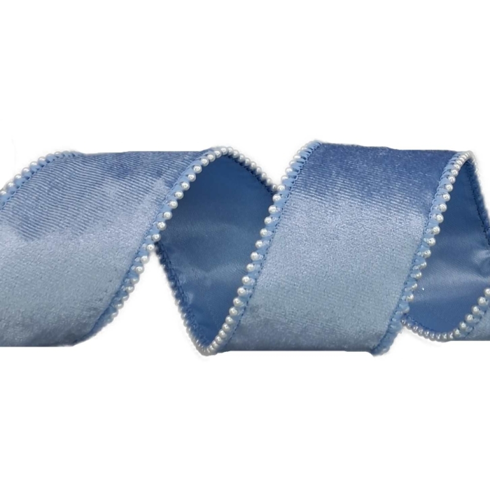 Sametová stuha ve světle modré barvě s perličkovým okrajem, luxusní vzhled vhodný pro svatby, zimní dekorace a dárky.
