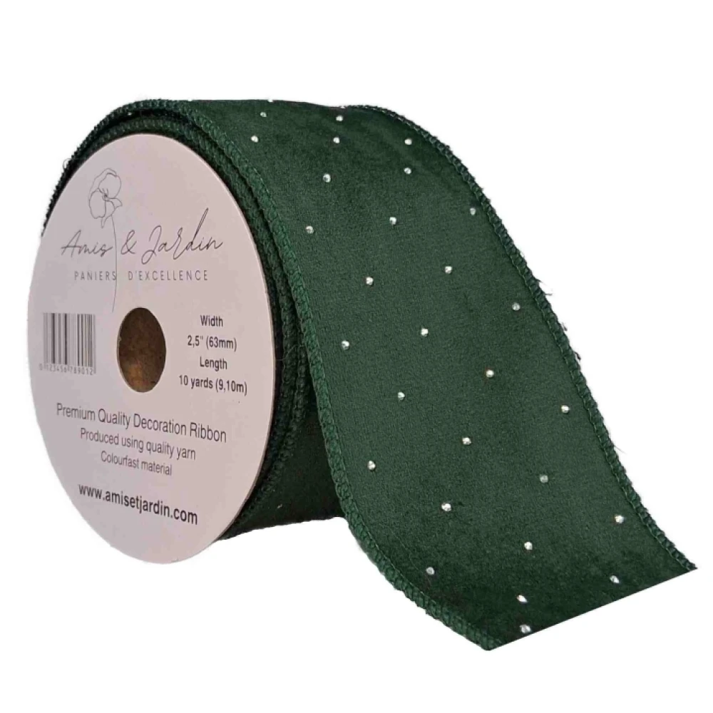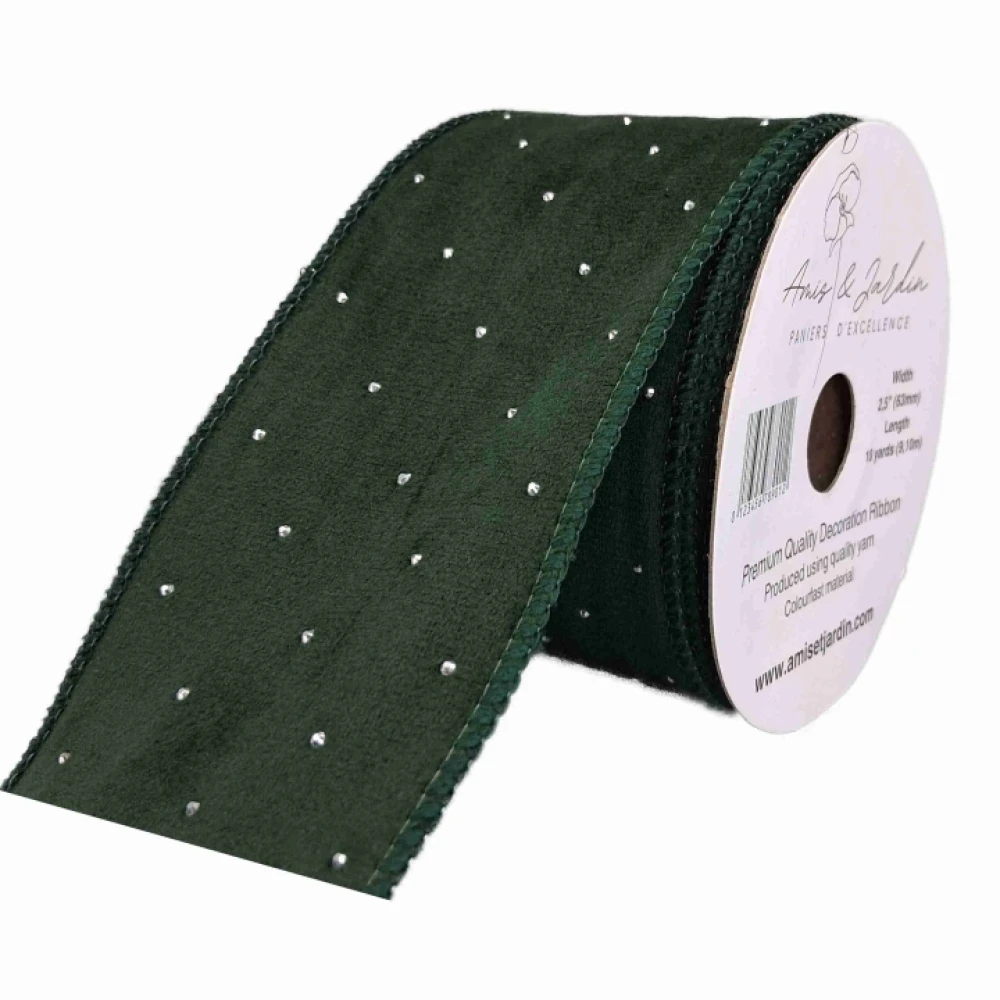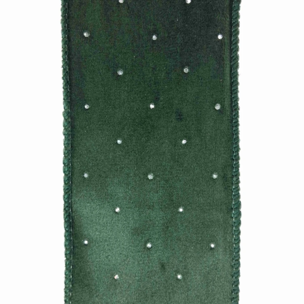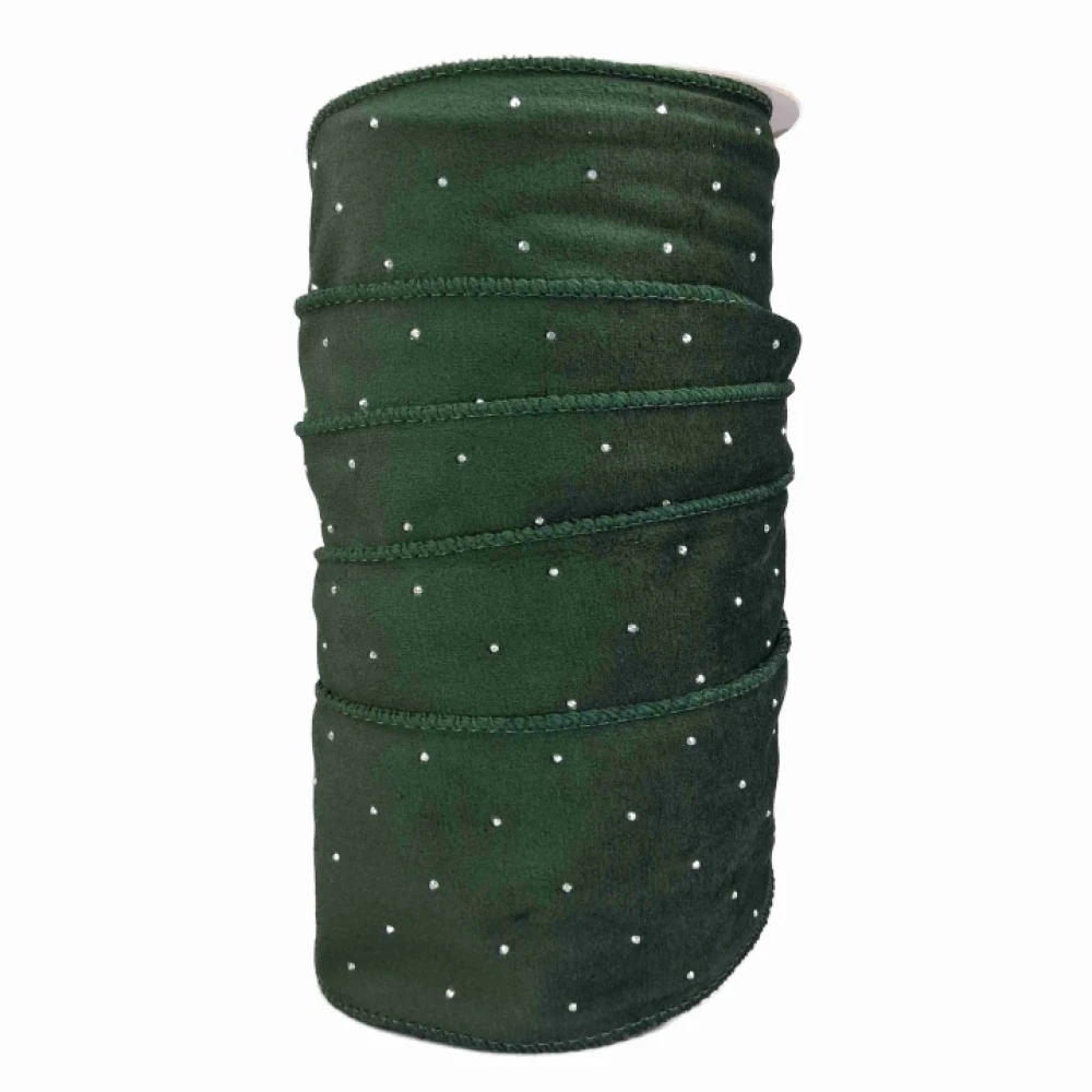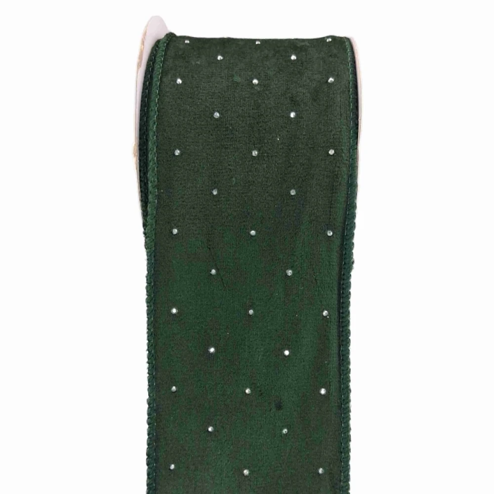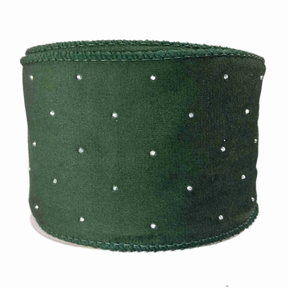 Stuha sametová s drátkem zelená vánoční perličky 9.1 m