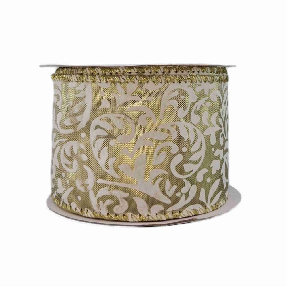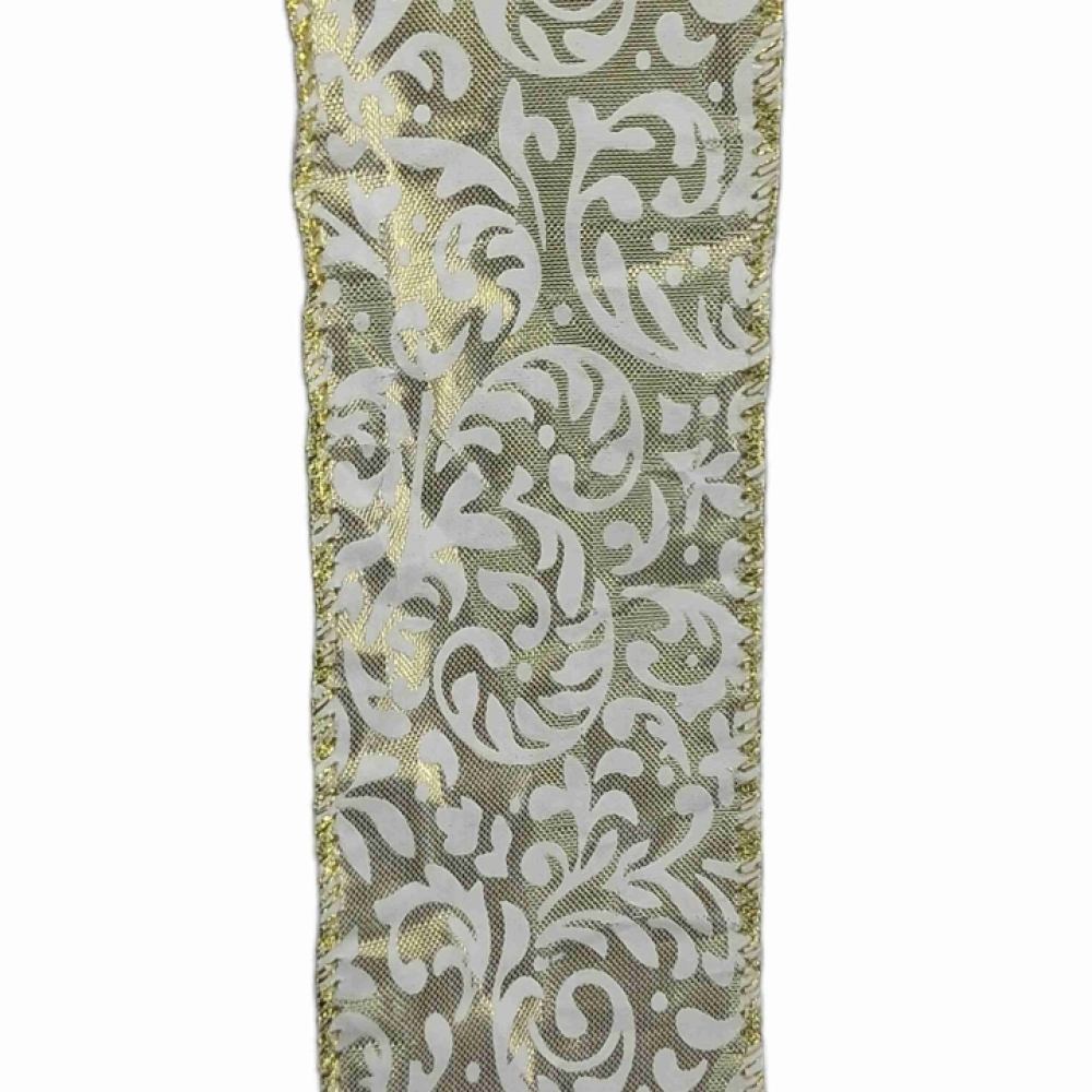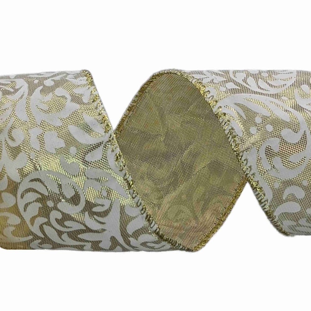 Luxusní stuha s bílým ornamentálním potiskem a zlatým lemem, vhodná na vánoční dekorace a dárky.
