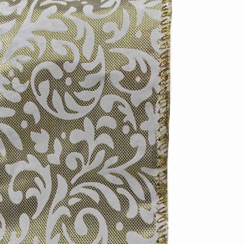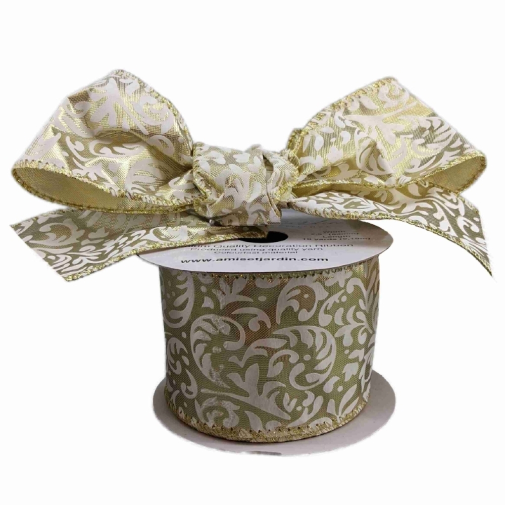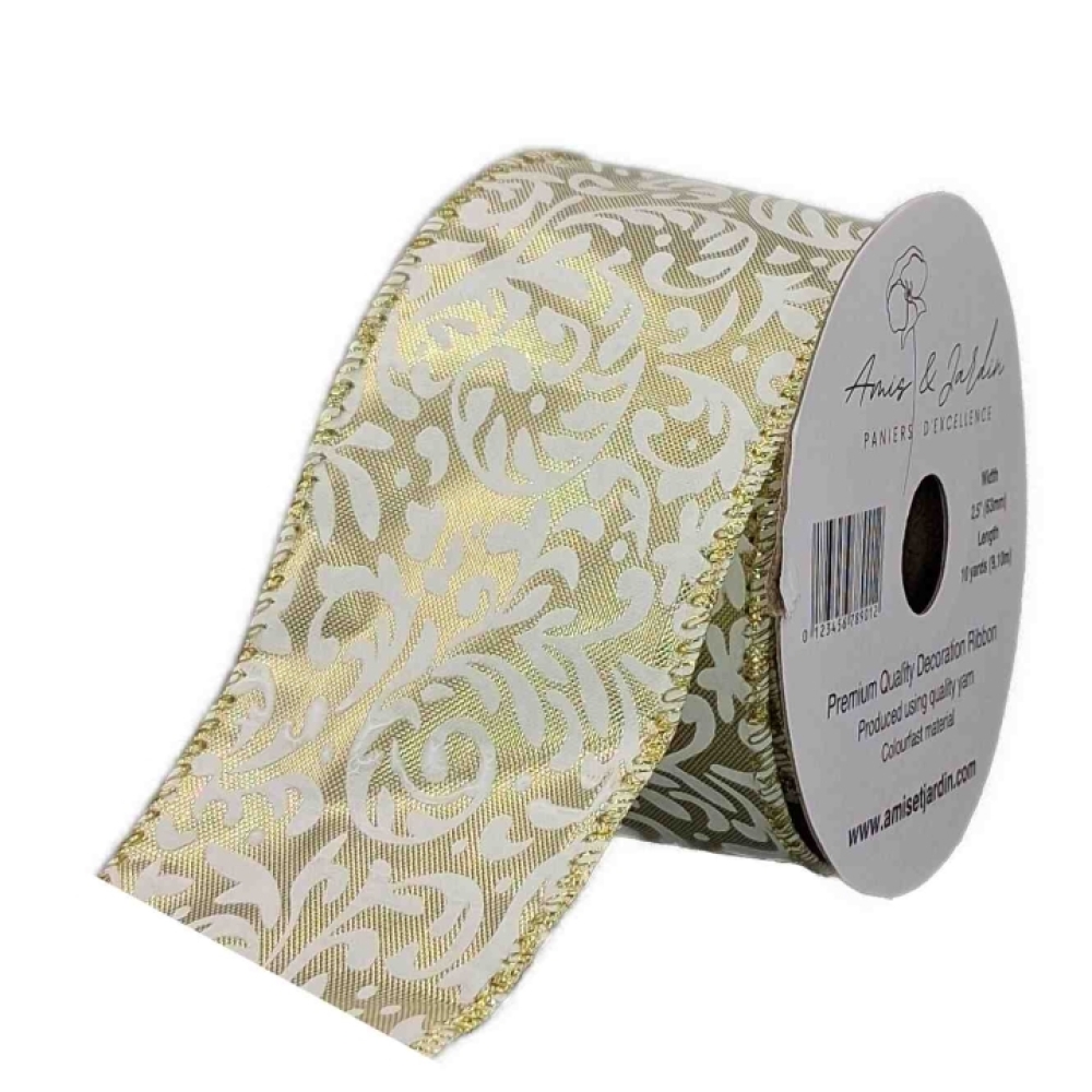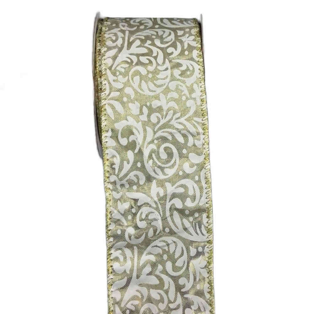 Luxusní stuha s bílým ornamentálním potiskem a zlatým lemem, vhodná na vánoční dekorace a dárky.