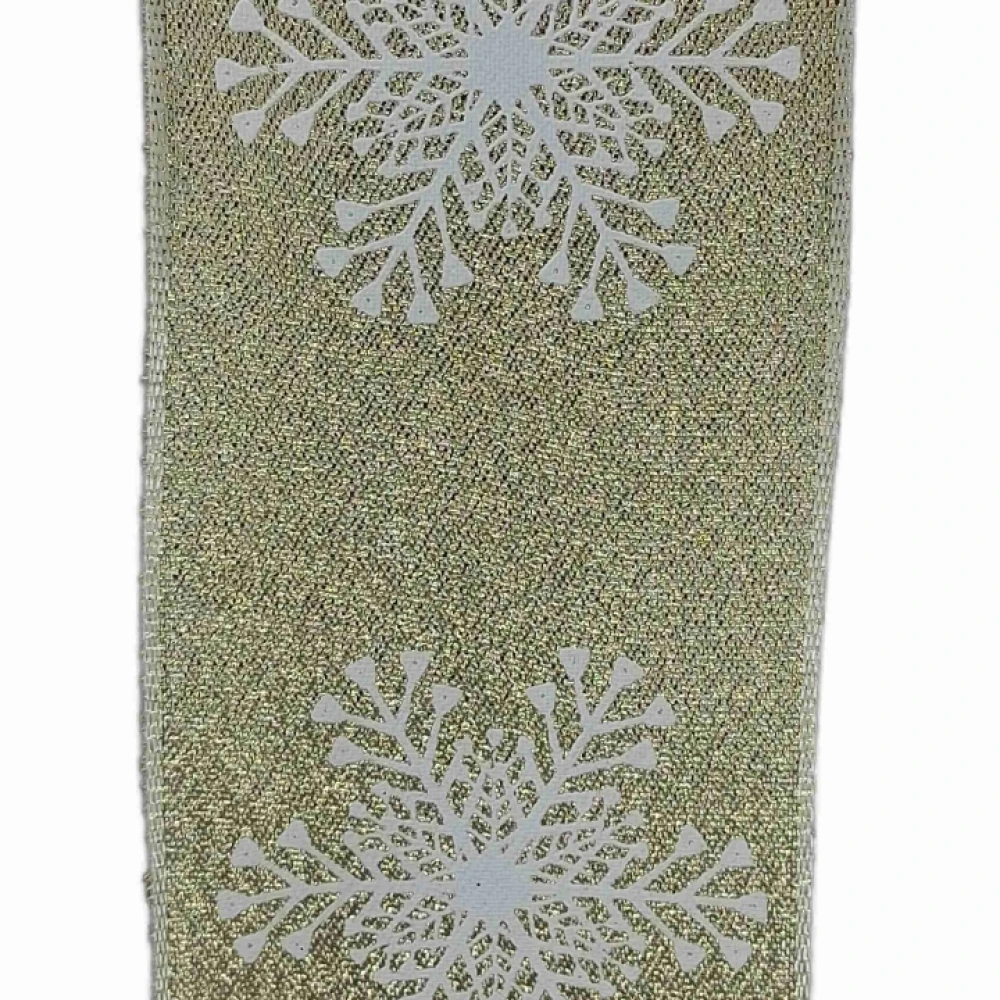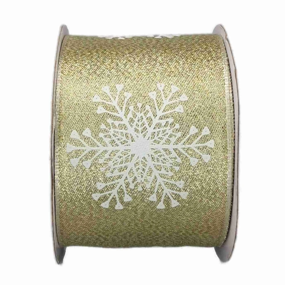 Stuha saténová s drátkem zlatá vánoční sněhové vločky 9.1 m