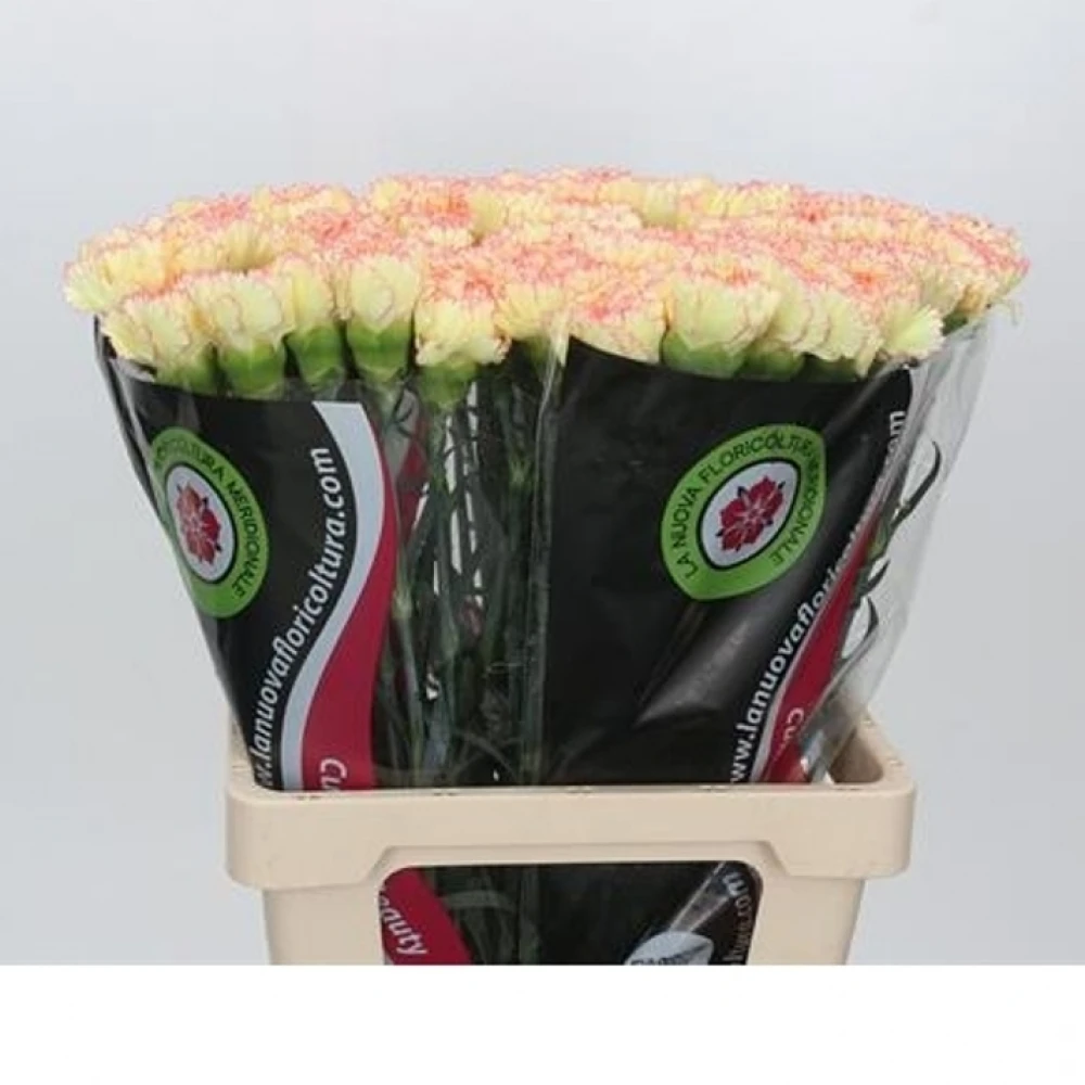 Svazek 20 jednokvětých karafiátů Reina oslavuje něžnost a eleganci. Každý květ je precizně vybrán a zdoben jemnými odlesky korálové na okvětních lístcích, které dokonale ladí s krémovým podkladem. Karafiáty Reina se pyšní bohatou texturou a dlouhou životností, která z nich dělá ideální volbu pro dekorace i jako dárek.