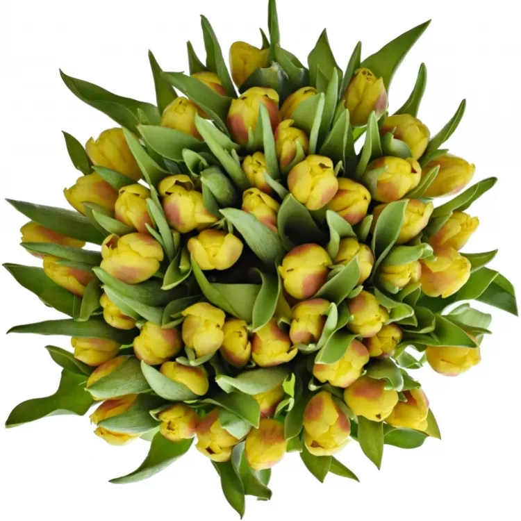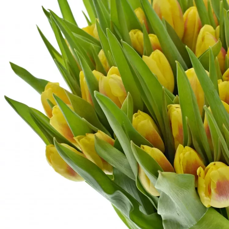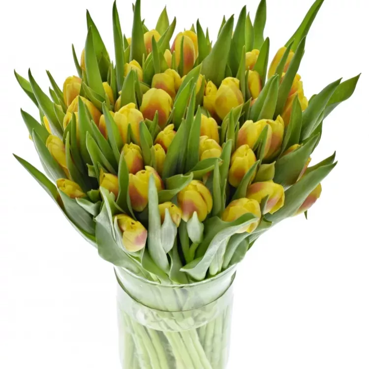 Tento překrásný žlutý tulipán kultivaru EN Brigitta s růžovým nádechem snad ani nemůže zapůsobit jinak. Ve váze mu bude slušet jednoduchost, takže jej můžete ponechat o samotě anebo mu najít společnost mezi bílými chryzantemami či růžovými růžemi.
