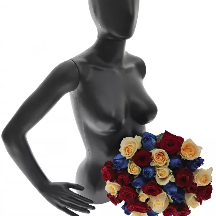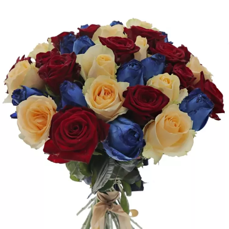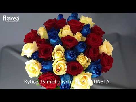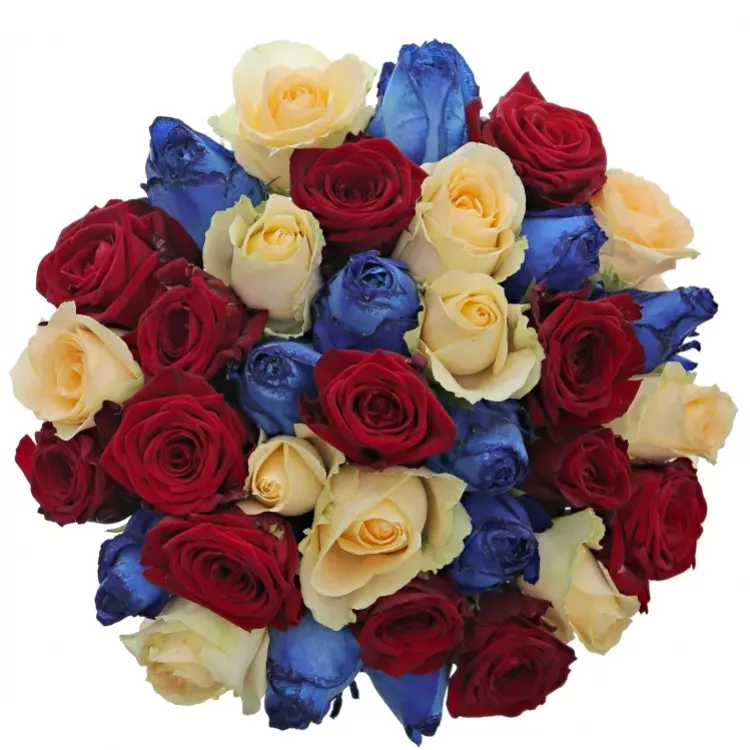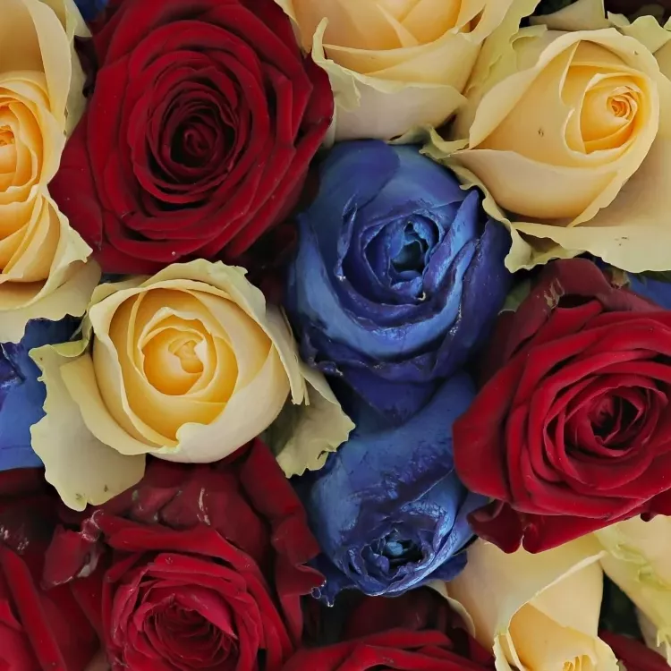 Hledáte-li kytici růží pro radost, pak jste ji právě našli. Optimistická barva meruňkových růží, červené růže se sametovým nádechem a magické modré růže dohromady vytváří kytici plnou radosti a dobré nálady.