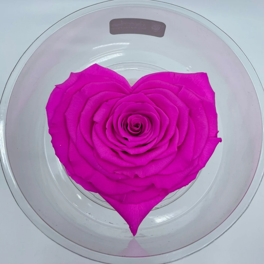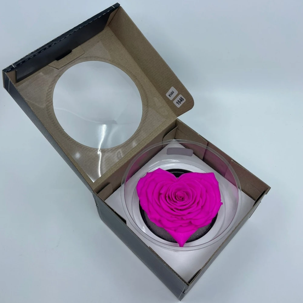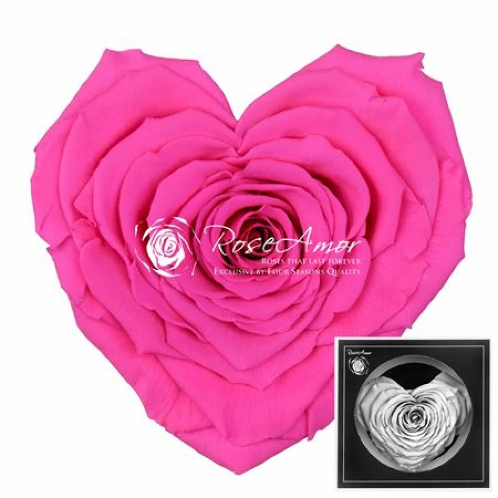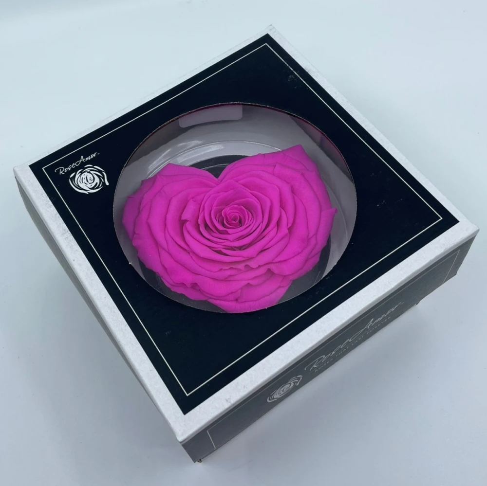 Stabilizovaná fuchsiová růže tvaru srdce od Rose Amor je ztělesněním elegance a trvalé krásy. Ručně vybírané květy jsou upraveny stabilizační technikou, která zadržuje jejich živost a texturu bez potřeby vody nebo denní péče, přičemž si udržují svoji svěžest měsíce až roky.