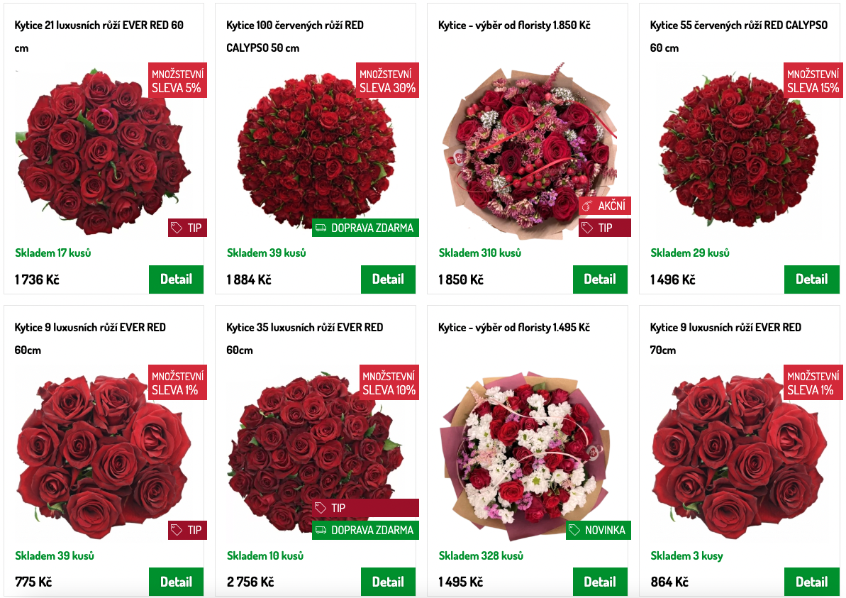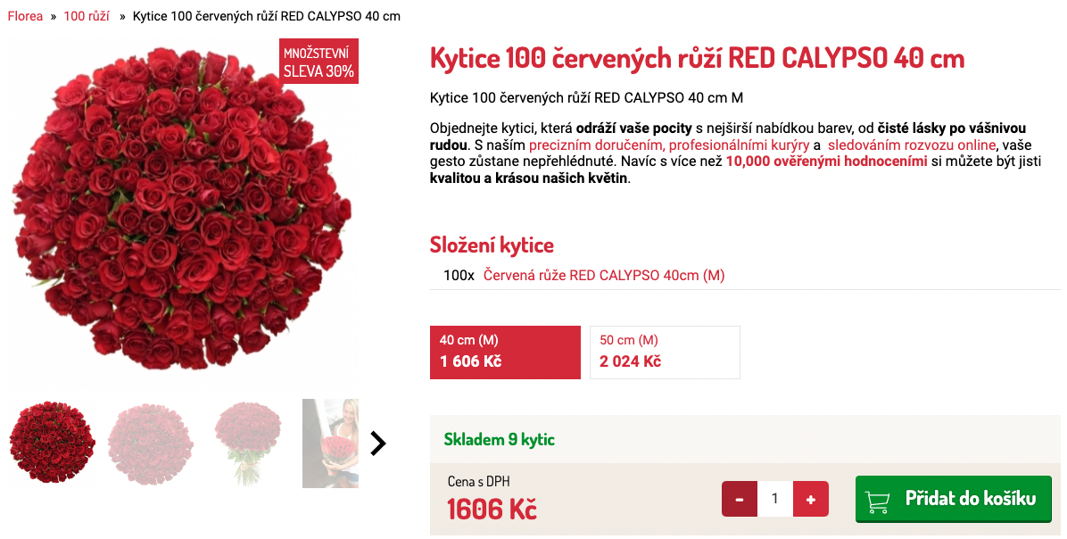 Jakmile si vyberete konkrétní květiny, stačí kliknout na obrázek a dostanete se na detail produktu. Zde si můžete vybrat počet květin, které chcete vložit do košíku.