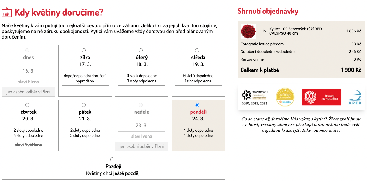 V dalším kroku vyberte den, kdy si přejete květiny doručit. Na Florea prodáváme pouze čerstvé a kvalitní květiny. Pokud chcete květinu poslat později, vyberte POZDĚJI a naše zákaznická podpora vás před vaším termínem kontaktuje s aktuální nabídkou čerstvých květin a kytic.