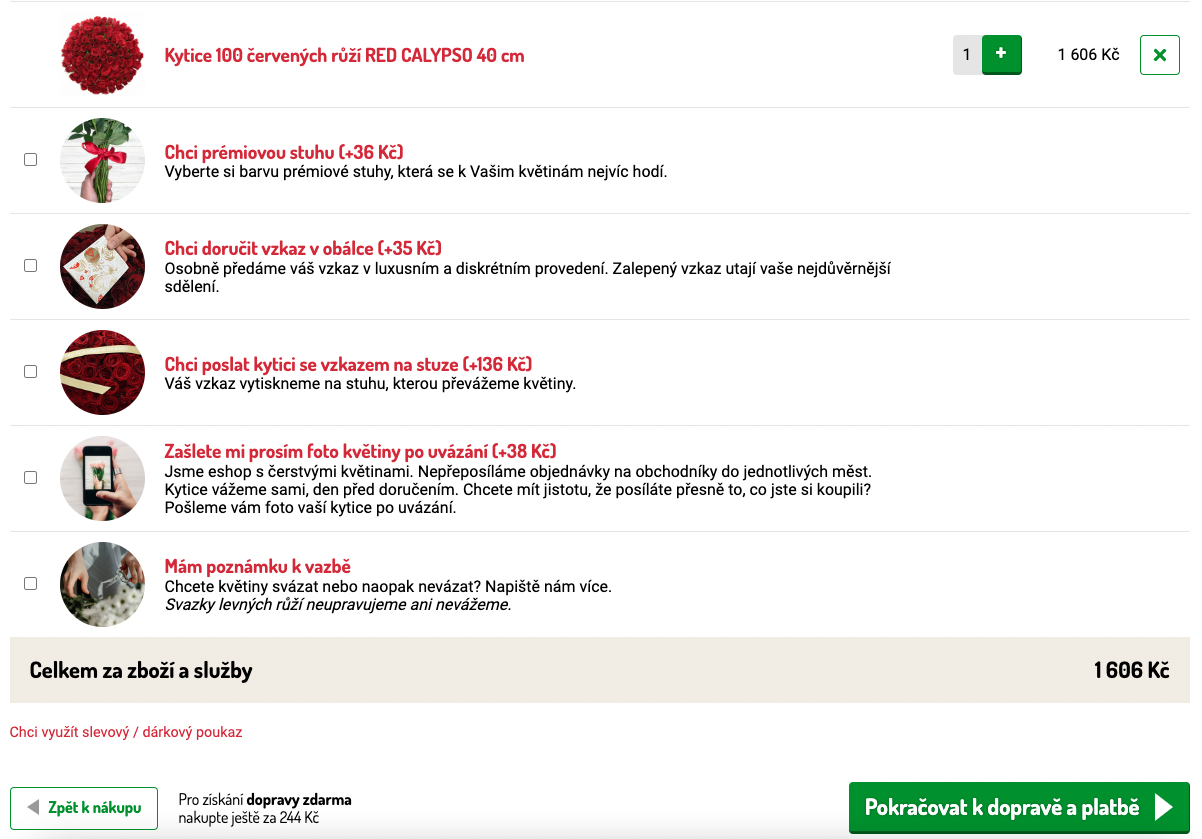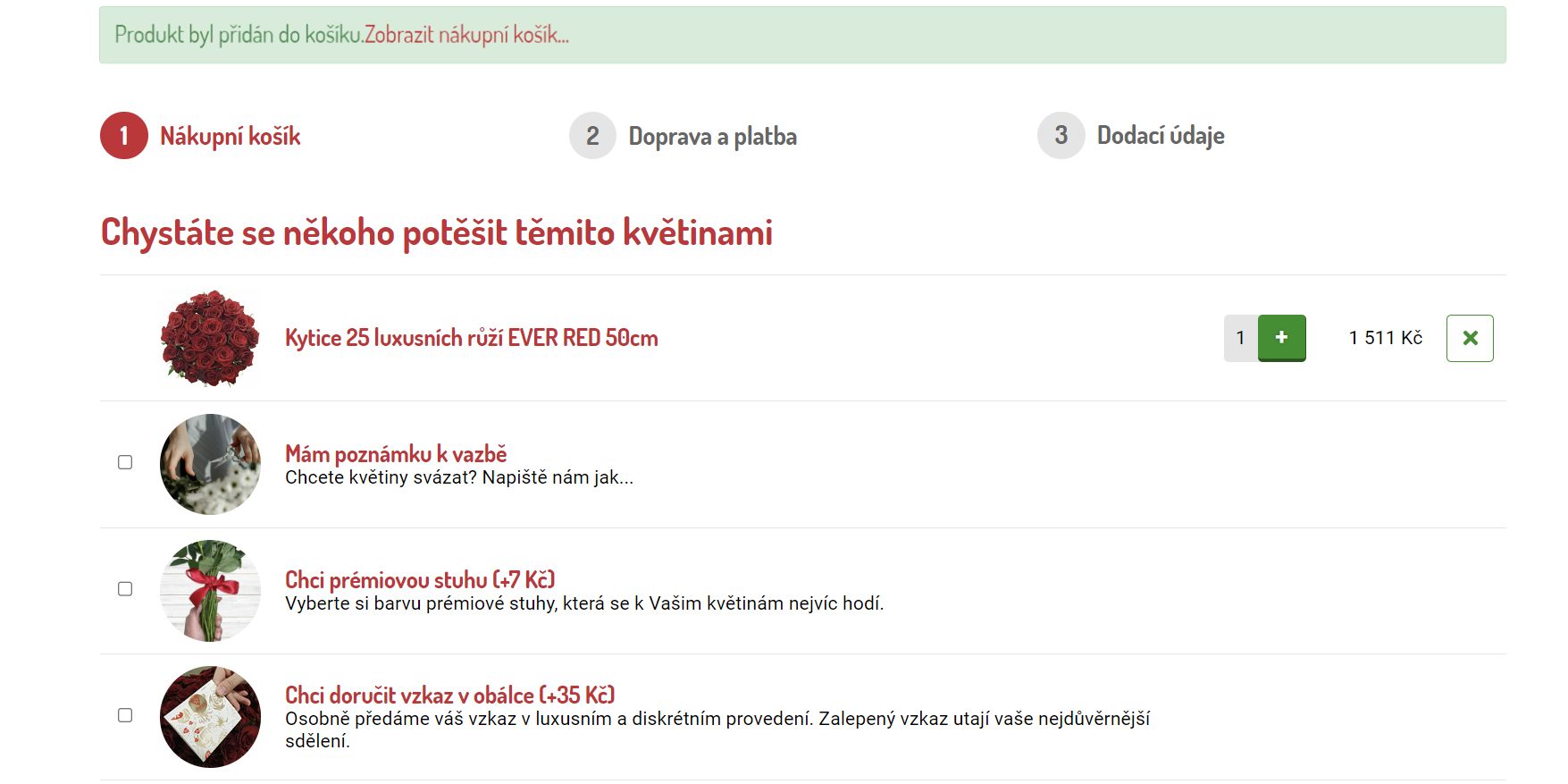 Po kliknutí na tlačítko PŘIDAT DO KOŠÍKU budete přesměrováni do košíku. Pokud budete chtít pokračovat v nákupu, stačí kliknout na tlačítko „Zpět k nákupu“. Počet květin na objednávku není nijak omezen.