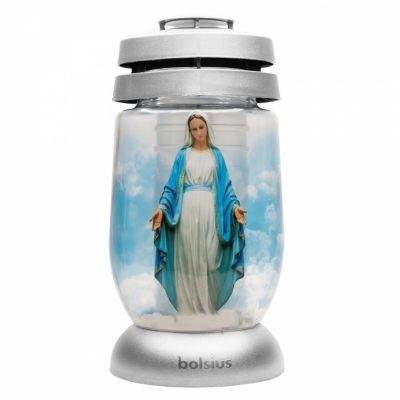 DetailHřbitovní lucerna skleněná Svatá Marie stříbrná 36 hod (výška 235 mm, šířka 110 mm)